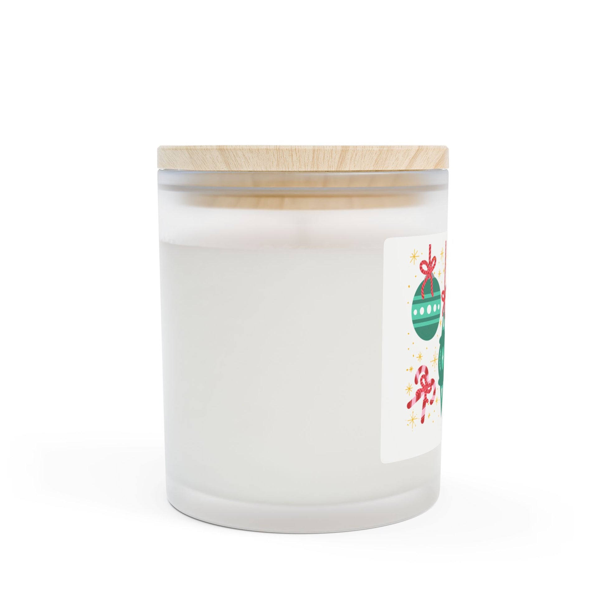 This 11 oz frosted glass candle features a wooden wick that softly pops like a tiny fireplace. The natural coconut–soy wax and raw maple lid give it a warm, handcrafted feel, while the label showcases a playful pattern of green Christmas ornaments hanging from red candy-stripe strings, accented with little candy canes—a vintage-modern festive touch.